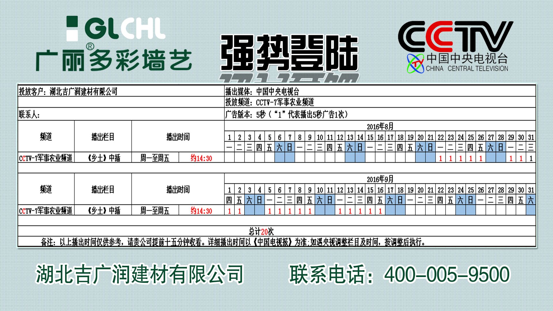 為了進一步提升廣麗多彩墻藝品牌形象,迅速拓展市場,經(jīng)過二個月申請及審批,廣麗多彩墻藝品牌展播廣告將于2016年8月22日正式于中國中央電視臺7臺,開始為期兩個月的播出,具體播出時間將以央視最終播出時間為準(zhǔn),也請代理商經(jīng)銷商通過當(dāng)?shù)刈杂型緩綄φ共バ畔⑦M行宣傳、促銷等活動!